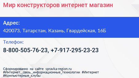 Мир конструкторов, интернет-магазин по адресу 420073, Татарстан, Казань, Гвардейская, 16Б в дальнейшем Организация, размещена в следующих категориях: