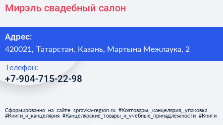 Мирэль, свадебный салон по адресу 420021, Татарстан, Казань, Мартына Межлаука, 2 в дальнейшем Организация, размещена в следующих категориях: