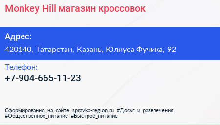 Monkey Hill, магазин кроссовок по адресу 420140, Татарстан, Казань, Юлиуса Фучика, 92 в дальнейшем Организация, размещена в следующих категориях: