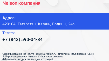 Nelson, компания по адресу 420104, Татарстан, Казань, Родины, 24в в дальнейшем Организация, размещена в следующих категориях: