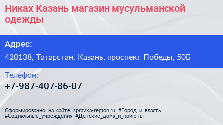 Никах Казань, магазин мусульманской одежды по адресу 420138, Татарстан, Казань, проспект Победы, 50Б в дальнейшем Организация, размещена в следующих категориях: