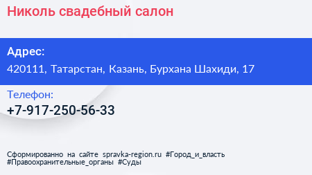 Николь, свадебный салон по адресу 420111, Татарстан, Казань, Бурхана Шахиди, 17 в дальнейшем Организация, размещена в следующих категориях: