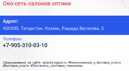 Око, сеть салонов оптики по адресу 420100, Татарстан, Казань, Рашида Вагапова, 3 в дальнейшем Организация, размещена в следующих категориях: