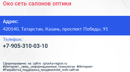 Око, сеть салонов оптики по адресу 420140, Татарстан, Казань, проспект Победы, 91 в дальнейшем Организация, размещена в следующих категориях: