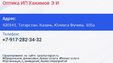 Оптика, ИП Хакимов Э.И. по адресу 420141, Татарстан, Казань, Юлиуса Фучика, 105а в дальнейшем Организация, размещена в следующих категориях: