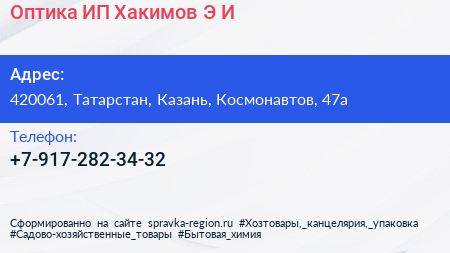 Оптика, ИП Хакимов Э.И. по адресу 420061, Татарстан, Казань, Космонавтов, 47а в дальнейшем Организация, размещена в следующих категориях: