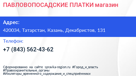ПАВЛОВОПОСАДСКИЕ ПЛАТКИ, магазин по адресу 420034, Татарстан, Казань, Декабристов, 131 в дальнейшем Организация, размещена в следующих категориях: