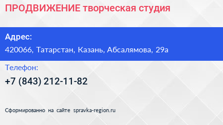 ПРОДВИЖЕНИЕ, творческая студия по адресу 420066, Татарстан, Казань, Абсалямова, 29а в дальнейшем Организация, размещена в следующих категориях: