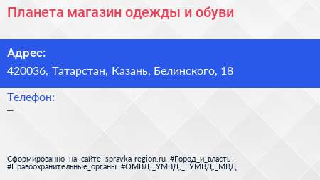 Планета, магазин одежды и обуви по адресу 420036, Татарстан, Казань, Белинского, 18 в дальнейшем Организация, размещена в следующих категориях: