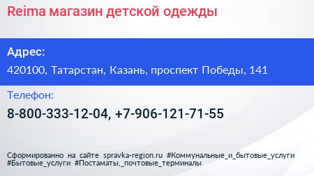 Reima, магазин детской одежды по адресу 420100, Татарстан, Казань, проспект Победы, 141 в дальнейшем Организация, размещена в следующих категориях: