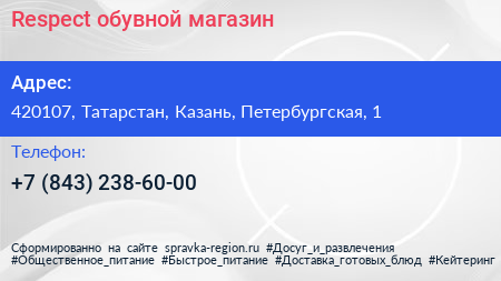 Respect, обувной магазин по адресу 420107, Татарстан, Казань, Петербургская, 1 в дальнейшем Организация, размещена в следующих категориях: