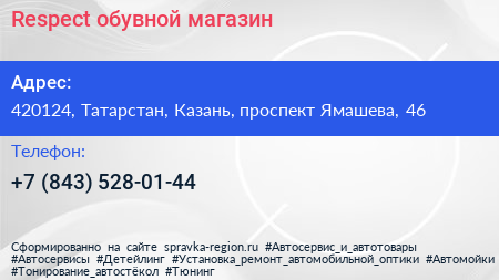 Respect, обувной магазин по адресу 420124, Татарстан, Казань, проспект Ямашева, 46 в дальнейшем Организация, размещена в следующих категориях: