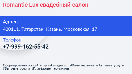 Romantic Lux, свадебный салон по адресу 420111, Татарстан, Казань, Московская, 17 в дальнейшем Организация, размещена в следующих категориях: