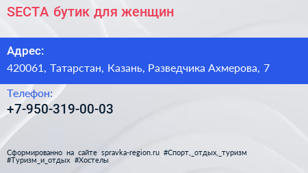 SECTA, бутик для женщин по адресу 420061, Татарстан, Казань, Разведчика Ахмерова, 7 в дальнейшем Организация, размещена в следующих категориях: