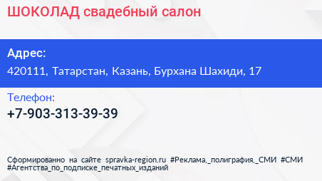 ШОКОЛАД, свадебный салон по адресу 420111, Татарстан, Казань, Бурхана Шахиди, 17 в дальнейшем Организация, размещена в следующих категориях: