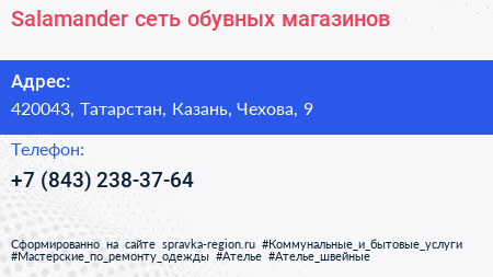 Salamander, сеть обувных магазинов по адресу 420043, Татарстан, Казань, Чехова, 9 в дальнейшем Организация, размещена в следующих категориях: