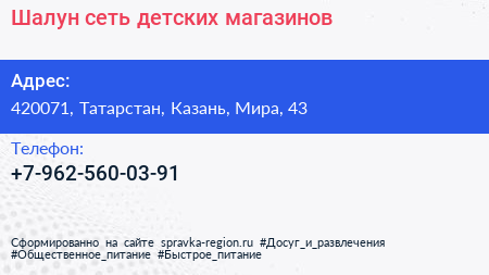 Шалун, сеть детских магазинов по адресу 420071, Татарстан, Казань, Мира, 43 в дальнейшем Организация, размещена в следующих категориях: