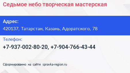 Седьмое небо, творческая мастерская по адресу 420137, Татарстан, Казань, Адоратского, 78 в дальнейшем Организация, размещена в следующих категориях: