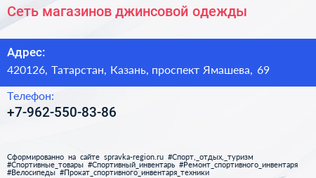 Сеть магазинов джинсовой одежды по адресу 420126, Татарстан, Казань, проспект Ямашева, 69 в дальнейшем Организация, размещена в следующих категориях:
