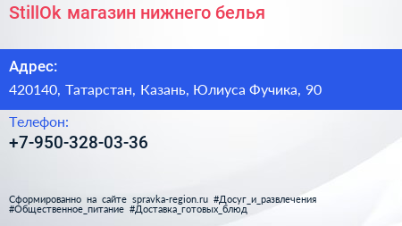 StillOk, магазин нижнего белья по адресу 420140, Татарстан, Казань, Юлиуса Фучика, 90 в дальнейшем Организация, размещена в следующих категориях: