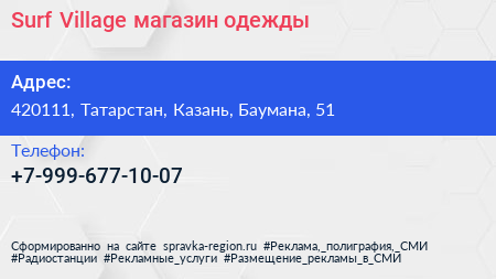 Surf Village, магазин одежды по адресу 420111, Татарстан, Казань, Баумана, 51 в дальнейшем Организация, размещена в следующих категориях:
