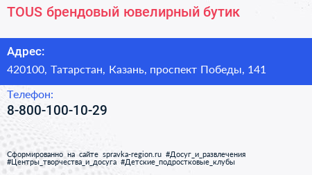 TOUS, брендовый ювелирный бутик по адресу 420100, Татарстан, Казань, проспект Победы, 141 в дальнейшем Организация, размещена в следующих категориях: