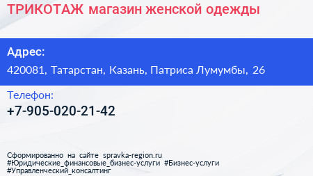 ТРИКОТАЖ, магазин женской одежды по адресу 420081, Татарстан, Казань, Патриса Лумумбы, 26 в дальнейшем Организация, размещена в следующих категориях: