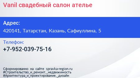 Vanil, свадебный салон-ателье по адресу 420141, Татарстан, Казань, Сафиуллина, 5 в дальнейшем Организация, размещена в следующих категориях: