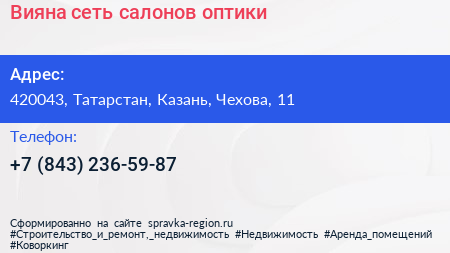 Вияна, сеть салонов оптики по адресу 420043, Татарстан, Казань, Чехова, 11 в дальнейшем Организация, размещена в следующих категориях: