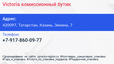 Victoria, комиссионный бутик по адресу 420097, Татарстан, Казань, Зинина, 7 в дальнейшем Организация, размещена в следующих категориях: