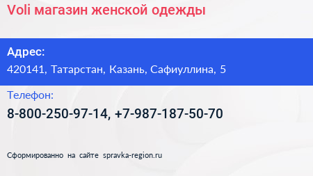 Voli, магазин женской одежды по адресу 420141, Татарстан, Казань, Сафиуллина, 5 в дальнейшем Организация, размещена в следующих категориях: