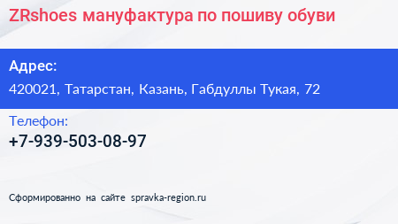 ZRshoes, мануфактура по пошиву обуви по адресу 420021, Татарстан, Казань, Габдуллы Тукая, 72 в дальнейшем Организация, размещена в следующих категориях: