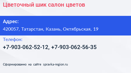 Цветочный шик, салон цветов по адресу 420057, Татарстан, Казань, Октябрьская, 19 в дальнейшем Организация, размещена в следующих категориях: