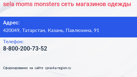 sela moms & monsters, сеть магазинов одежды по адресу 420049, Татарстан, Казань, Павлюхина, 91 в дальнейшем Организация, размещена в следующих категориях: