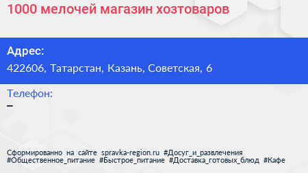 1000 мелочей, магазин хозтоваров по адресу 422606, Татарстан, Казань, Советская, 6 в дальнейшем Организация, размещена в следующих категориях: