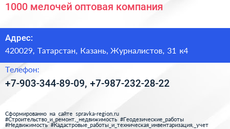 1000 мелочей, оптовая компания по адресу 420029, Татарстан, Казань, Журналистов, 31 к4 в дальнейшем Организация, размещена в следующих категориях: