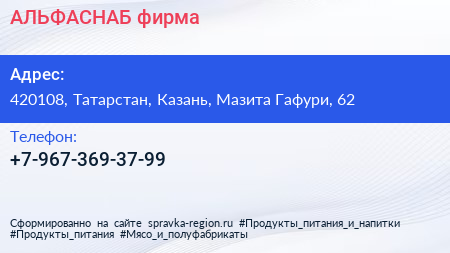 АЛЬФАСНАБ, фирма по адресу 420108, Татарстан, Казань, Мазита Гафури, 62 в дальнейшем Организация, размещена в следующих категориях: