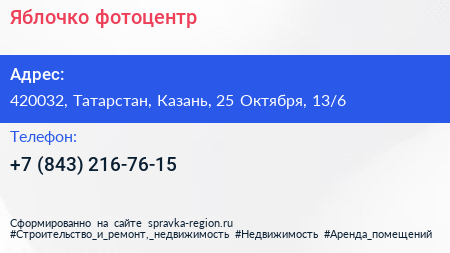 Яблочко, фотоцентр по адресу 420032, Татарстан, Казань, 25 Октября, 13/6 в дальнейшем Организация, размещена в следующих категориях: