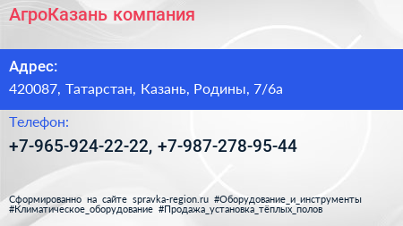 АгроКазань, компания по адресу 420087, Татарстан, Казань, Родины, 7/6а в дальнейшем Организация, размещена в следующих категориях: