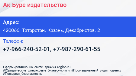 Ак Буре, издательство по адресу 420066, Татарстан, Казань, Декабристов, 2 в дальнейшем Организация, размещена в следующих категориях:
