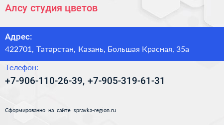 Алсу, студия цветов по адресу 422701, Татарстан, Казань, Большая Красная, 35а в дальнейшем Организация, размещена в следующих категориях: