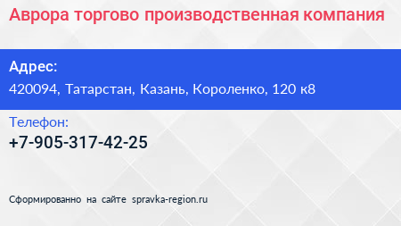 Аврора, торгово-производственная компания по адресу 420094, Татарстан, Казань, Короленко, 120 к8 в дальнейшем Организация, размещена в следующих категориях: