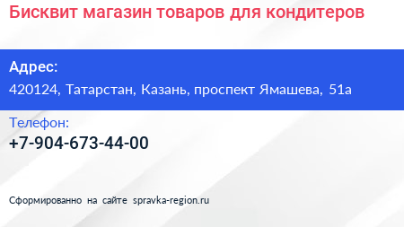 Бисквит, магазин товаров для кондитеров по адресу 420124, Татарстан, Казань, проспект Ямашева, 51а в дальнейшем Организация, размещена в следующих категориях:
