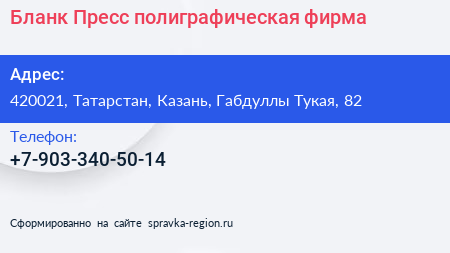 Бланк-Пресс, полиграфическая фирма по адресу 420021, Татарстан, Казань, Габдуллы Тукая, 82 в дальнейшем Организация, размещена в следующих категориях:
