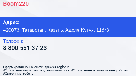 Boom220 по адресу 420073, Татарстан, Казань, Аделя Кутуя, 116/3 в дальнейшем Организация, размещена в следующих категориях: