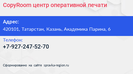 CopyRoom, центр оперативной печати по адресу 420101, Татарстан, Казань, Академика Парина, 6 в дальнейшем Организация, размещена в следующих категориях:
