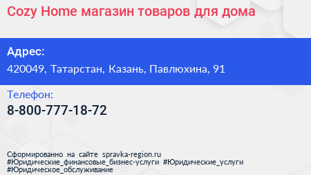Cozy Home, магазин товаров для дома по адресу 420049, Татарстан, Казань, Павлюхина, 91 в дальнейшем Организация, размещена в следующих категориях: