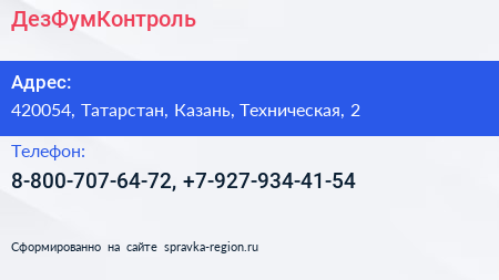 ДезФумКонтроль по адресу 420054, Татарстан, Казань, Техническая, 2 в дальнейшем Организация, размещена в следующих категориях: