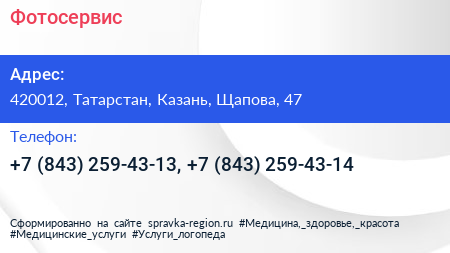 Фотосервис по адресу 420012, Татарстан, Казань, Щапова, 47 в дальнейшем Организация, размещена в следующих категориях: