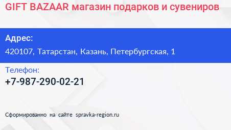 GIFT BAZAAR, магазин подарков и сувениров по адресу 420107, Татарстан, Казань, Петербургская, 1 в дальнейшем Организация, размещена в следующих категориях: